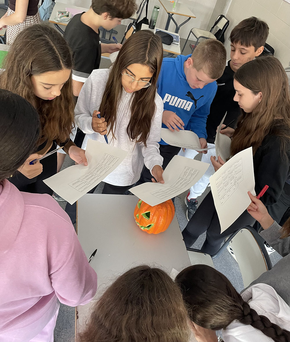 A 1r d’ESO, l’alumnat ha participat en un bingo especial de Halloween, que ha servit d’excusa per acabar amb un divertit “trick or treat”. Han respost preguntes, han guanyat dolços i han gaudit d’un joc de taula temàtic que els ha permés continuar descobrint curiositats sobre aquesta celebració.